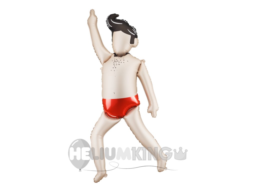 Izviren folijski balon v obliki plešočega moškega v rdečih kopalkah je zabavna dekoracija za zabave, partije ali tematske večere. Zaradi svoje velike velikosti in smešnega dizajna takoj pritegne pozornost in je idealen tudi kot rekvizit za foto kotiček.