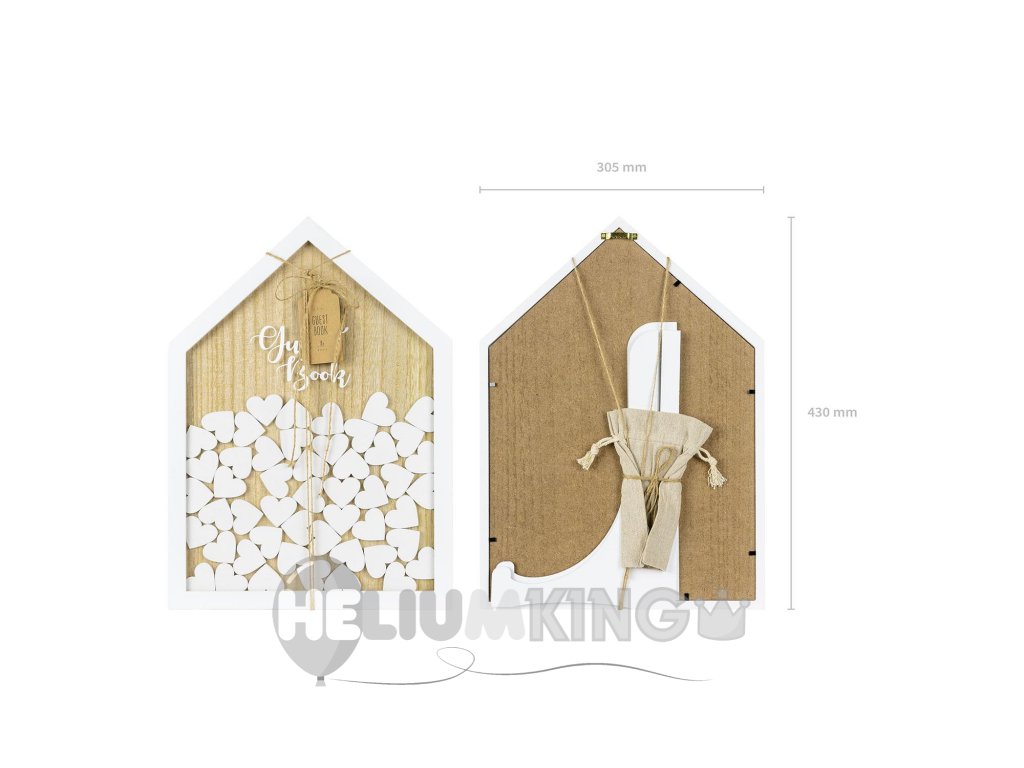 Ta Knjiga gostov v leseni izvedbi v obliki hiške, vam bo polepšala poročni dan. Knjiga vsebuje 50 kos srčkov, na na katere se lahko vaši gostje podpišejo.