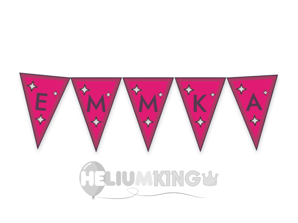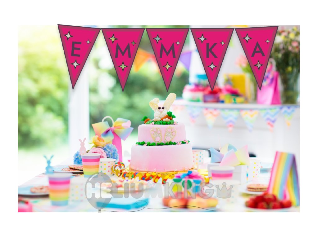 Vaša girlanda lahko vsebuje poljuben napis po vaši izbiri, v dolžini od 4 do 8 znakov. Dodate lahko ime slavljenca, besedo ali katerokoli drugo kratko sporočilo, ki ga želite poudariti. Besedilo je lahko ustvarjeno v različnih slogih pisave in barvah, da se popolnoma ujema s celotnim dizajnom.