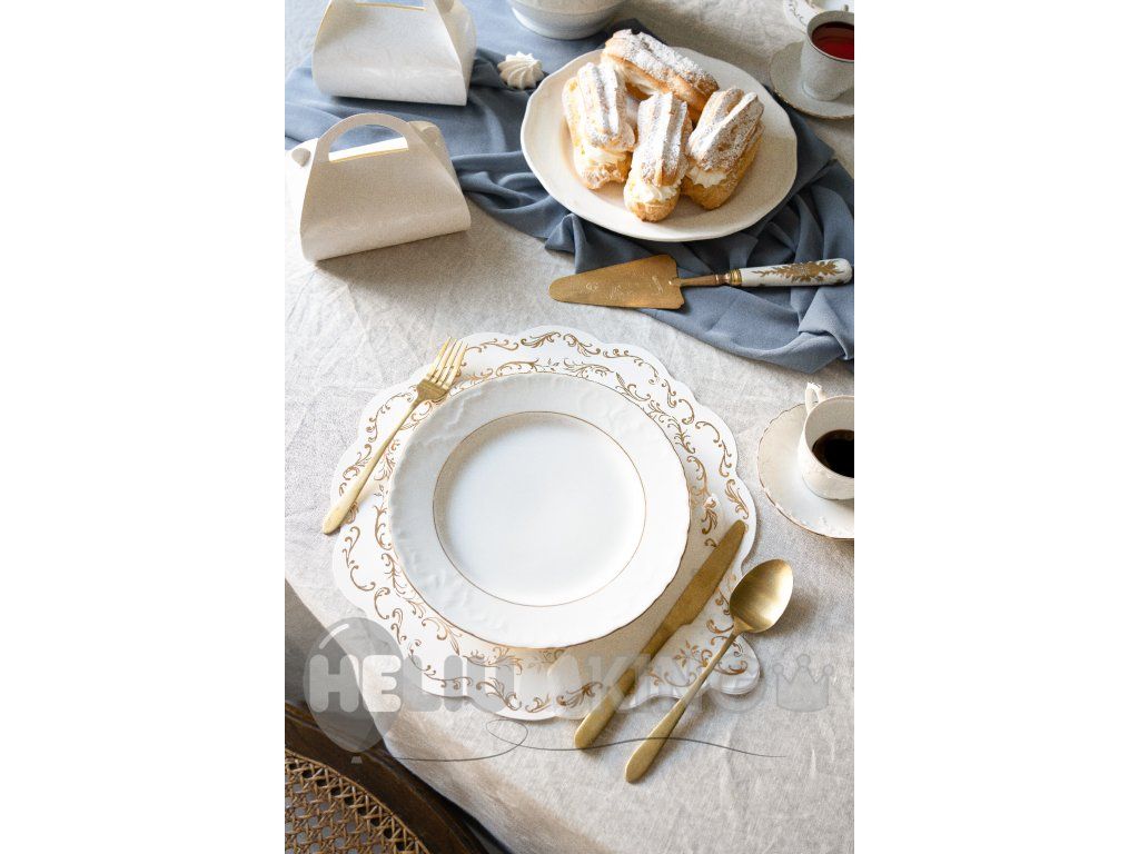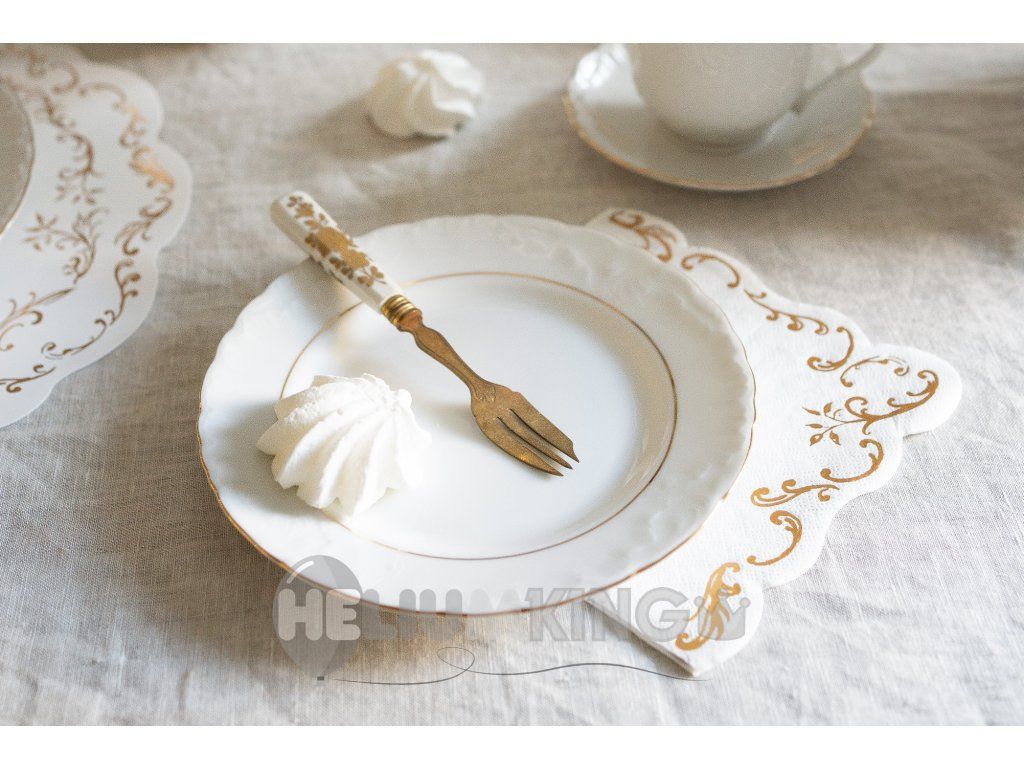 Elegantni beli papirnati prtički z zlatim bleščečim ornamentom so idealni za slavnostne priložnosti, praznovanja ali zabave. Ti prtički bodo vašim mizam dali eleganten in razkošen videz.