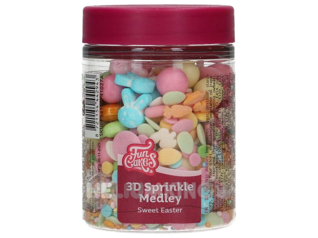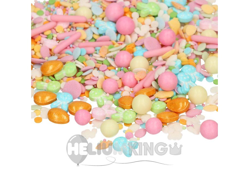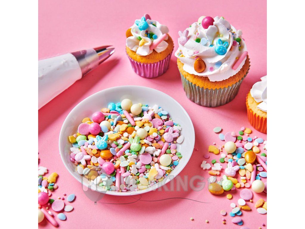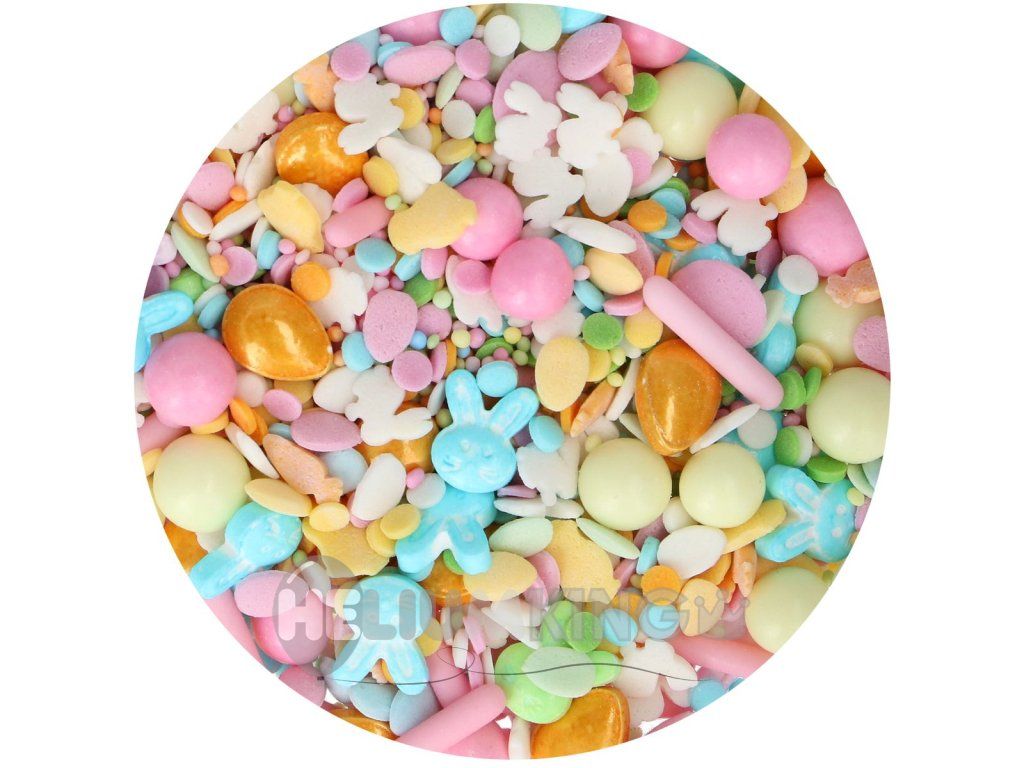 Premium mešanica sladkornih posipov z velikonočnim motivom, ki takoj doda tortam, cupcakesom in piškotom praznični videz. Vsebuje barvne kroglice, konfete in igrive 3D oblike v praktični posodi s pokrovom. Idealno za velikonočno in spomladansko peko.