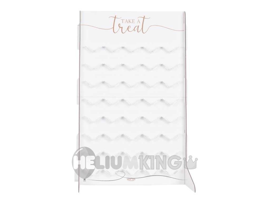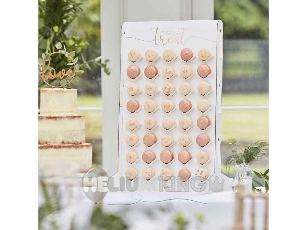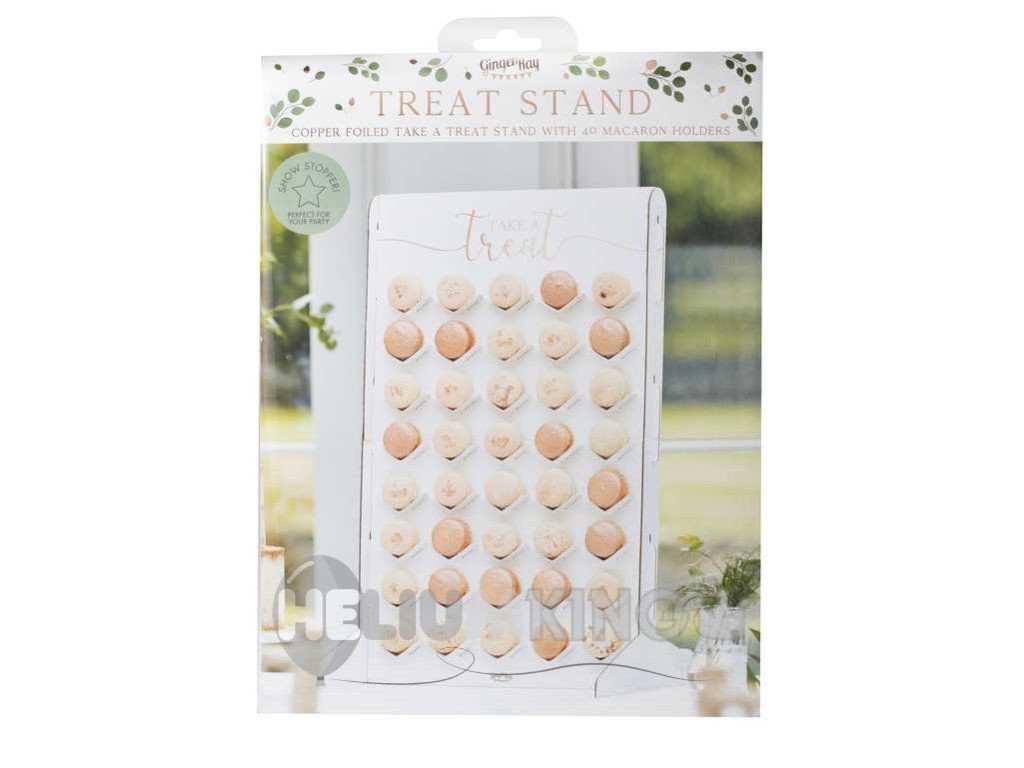 Napolnite to stojalo s svojimi najljubšimi makroni in spremenite svojo mizo z dobrotami v popolno darilo za zabavo! Stojalo vsebuje 40 majhnih podstavkov, ki jih lahko enega za drugim napolnite s svojimi najljubšimi makroni. Postavite jih v podstavke in pustite gostom, da jih jedo ves dan! V paketu boste našli stojalo, ki ga lahko preprosto sestavite sami. V paketu boste našli tudi 40 podstavkov. 5 makronov v vrstici. Na vrhu boste našli roza in zlati znak Take a Treat.