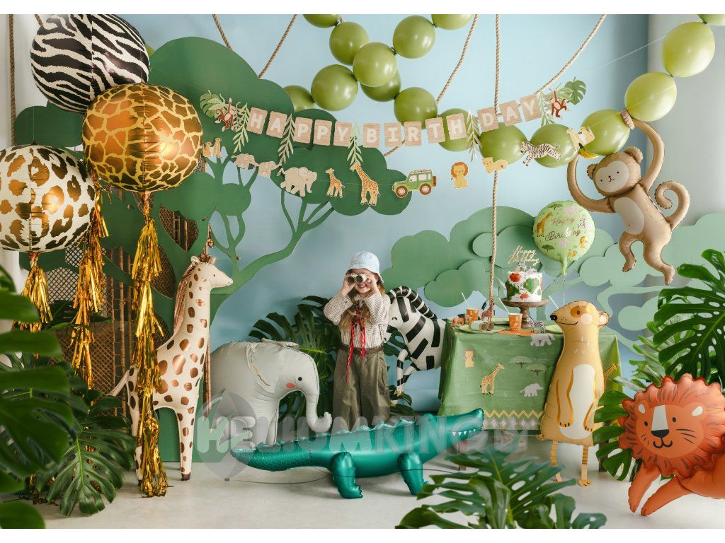 Stilska in igriva dekoracija, ki bo ustvarila popolno rojstnodnevno vzdušje. Komplet vsebuje bež transparent z napisom »Happy Birthday«, dopolnjen z motivi listov in opic (dolžina 180 cm), in girlando s safari motivi (dolžina 180 cm). Oba dela sta povezana z zlato vrvico s skupno dolžino približno 280 cm. Transparent je pripravljen za takojšnjo uporabo neposredno iz embalaže in je zaradi svojega izvirnega dizajna idealen za otroške zabave, tematske žurke ali družinska srečanja.